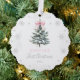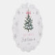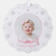 Celebrate a sweet First Christmas with this delicate paper ornament card featuring a snowy evergreen tree, soft silver snowflakes, and a charming blush pink bow. The scalloped shape and photo-backed design create a keepsake look that families will treasure year after year. Perfect for gifting, hanging on the tree, or sending as a thoughtful holiday card.