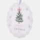 Celebrate a sweet First Christmas with this delicate paper ornament card featuring a snowy evergreen tree, soft silver snowflakes, and a charming blush pink bow. The scalloped shape and photo-backed design create a keepsake look that families will treasure year after year. Perfect for gifting, hanging on the tree, or sending as a thoughtful holiday card.