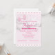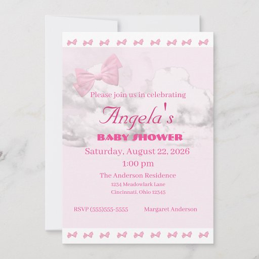 Design features a light pink background to the image of a pink bow amid white puffy clouds. Top and bottom are bordered by white with the images of tiny pink bows. Text is featured in a bright pink, the name of guest of honor in a large, elegant font. Event type is displayed in a large, bold font. Date and time are displayed below in an easy-to-read print. R.S.V.P. information is displayed at bottom.