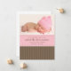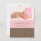 Pink and brown birth announcement features brown vertical stripes along the bottom and a pink strip where your baby's birth details sit.