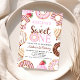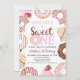 Girl's sweets or donut themed first birthday invitation featuring various donuts and some cupcakes mainly in pink and brown. This sweet one birthday invitation is ideal for a donut or sweets themed first birthday party for a baby girl.