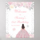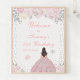 This elegant and glamourous winter birthday party welcome sign features a beautiful princess with brunette hair and fair skin in a pink ball gown. The text combines handwritten script and modern sans serif fonts for a classy and sophisticated look. The floral arrangements, snowflakes and silver confetti create the perfect blend of rustic and chic.