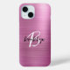 This elegant personalised phone case features a monogram and first name in modern black and white script on a trendy pink brushed metal background.