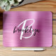 This elegant personalised mouse pad features a monogram and first name in modern black and white script on a trendy pink brushed metal background.