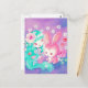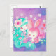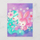 Cute chibi girl with flowing turquoise hair, lovingly petting her pet pink bunny.