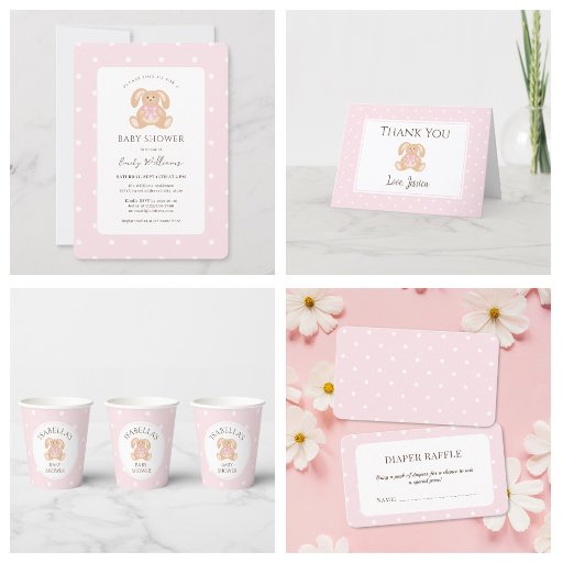 Elegant vintage classic bunny rabbit on pink and white polka dots girl baby shower.