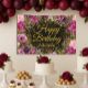 Elegant and romantic pink, burgundy, and purple watercolor vintage floral and foliage on black custom "Happy birthday" party banner with gold glitter. Personalised with the name of the guest of honour. Contact me for assistance with your customisations or to request additional matching or coordinating Zazzle products for your party.