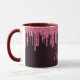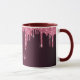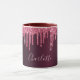 An elegant, girly and glamourous mug. Dark pink cherry coloured faux glitter drips. Deep, dark moody burgundy gradient background. Personalise and add a name. The name is written with a modern hand lettered style script. Light pink coloured letters.