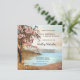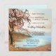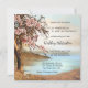 A spring wedding invitation featuring a fine art painting of an ocean with a cherry blossom tree and butterflies in lovely pink colours.