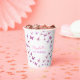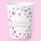 This pretty pink butterfly themed paper cup is perfect for a baby girl's "Our Little Butterfly Is turning One" party. It features a butterfly pattern on a white background, and text that you can customise with your own details. The template is customisable in the listing editor.