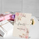 A soft beige background decorated with pink roses, florals, pampas grass and a large butterfly. With the text: favours. Please take one!
