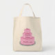 Painting of a three tiered pink cake decorated with light pink hearts and dark pink trim, setting on a silver platter, with placeholders for your personalised text, is printed on custom tote bags. The text is easy to customise and coordinates with the cake. Thank you for your patronage of CherylsArt on Zazzle.