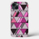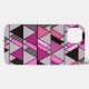 This phone case has a mid-century modern design of overlapping triangles running horizontally in pink camo colours on a field of light grey.