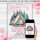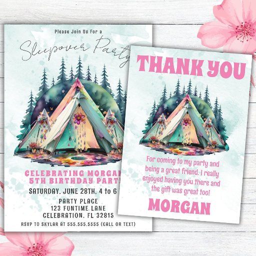 Pink camping sleepover birthday party invitation for a fun vibe girl birthday party digital download or printable invitation. Customise names, dates, and information.