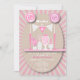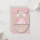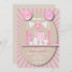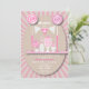 A birthday party invitation featuring an illustration of a buffet of pink candy. Illustration includes lollipops with bunting in between, gumballs, stick candy, and rock candy. Oval and sunburst background. Personalise the text.