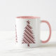 Mug in a classic silhouette of a Christmas tree in pastel strawberry pink, patterned with dark chocolate brown candy stripes