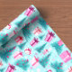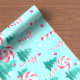 Pink pastel colourful holiday wrapping paper with cute items such as candy canes, stockings and presents on blue and teal backgrounds.