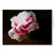 A single pink carnation flower bud,is photographed against a dark background. Strikingly beautiful, this floral photo captures the bloom and the crinkled petals in detail, which features shades of the palest creamy whites and pinks to bright fuschia.