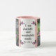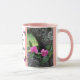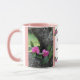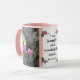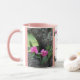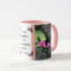 This elegant pink and white mug shows two beautiful pink carnations nestled in the crook of a lichen-covered oak tree. The scripture on this mug is from Psalm 139:14 which says, "I am fearfully and wonderfully made."