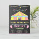 Amaze your guests with this cute carnival theme birthday party invitation featuring a circus tent and pink cotton candies with pastel typography against a chalkboard background. Simply add your event details on this easy-to-use template to make it a one-of-a-kind invitation. Flip the card over to reveal a pink and white stripes pattern on the back of the card.