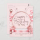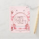 Custom birthday postcard presenting a festive pink celebration with "Happy Birthday To You!" with pink balloons and presents, personalised with your name and date, and light pink on both sides.