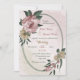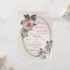 Unique wedding invitation featuring romantic pink and champagne flowers and green leaves on a beautiful oval geometric frame.