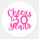 A pink cheers to 30 years sticker to add a great touch to a 30th birthday party, a 30th birthday gift, birthday seal and more.