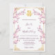 This contemporary Chinese wedding invitation features a golden Asian frame, pink cherry blossoms and a golden artistic double happiness symbol on a white background. With a custom photo and a scannable qr code on the backside.