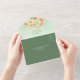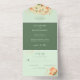 Pink Cherry Blossoms, Wedding All In One Invitation featuring hand painted joyful blossom spring flowers over splatters in the same colours. The background is dark lime green and light lime green. Customise this "Pink Cherry Blossoms, Wedding Invitation" to add a special touch. Personalise by adding your own wedding details. For further customisation (background, fonts, borders), please click the "Personalise” link and use our design tool to modify this template.