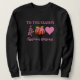 Stylish Pink CHRISTMAS BLESSINGS sweatshirt for men and women of all ages. The design shows a heart, Christmas pudding and modern Christmas tree graphic in popular trending pink colour. At the top the wording reads 'TIS THE SEASON and underneath reads CHRISTMAS BLESSINGS. All text is CUSTOMIZABLE so you can personalise this pink Christmas shirt by adding your name and creating matching sweatshirts for all the family.