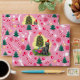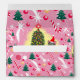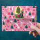 This is a beautiful, playful, joyous pink Christmas design. It features an illustration of a black cat with a Christmas tree and a pattern of candies, tiny green trees, snowflakes and shooting stars floating around.