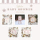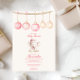 This festive baby shower design features a hand-painted baby elephant in a Santa hat, surrounded by blush pink and gold ornaments dangling from rustic twine. Soft watercolor textures and sweet holiday tones create a cosy, whimsical atmosphere — perfect for celebrating a winter baby girl with warmth and charm.