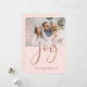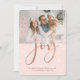 This simple, modern Christmas design features the word "joy" in faux rose gold typography on a blush pink background, with your own favourite photo at the top. Subtle white snowflakes are scattered across the background.