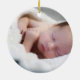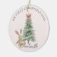 Baby girl's first Christmas ornament featuring pink watercolor Christmas tree with personalized name and photo.