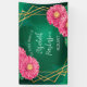 A delicate watercolor illustration featuring a gold geometric frame set against an emerald green background. The frame is adorned with vibrant hot pink chrysanthemums placed along the outer edges. The entire design has a soft watercolor texture, blending elegance with a natural floral touch.