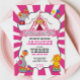 Pink and white carnival theme birthday invitation with colourful details of what you see in a carnival.