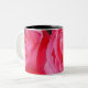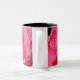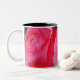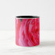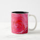 The original photograph by MaeFlowers on this Mug is a closeup of two bright pink climbing roses, fresh from the garden. The rose petals, in light and shadow, are many shades of pink, from pale to deep. One rose faces us directly, showing the tips of the petals as they curve around to the centre. The other rose, beside and slightly behind the first, is turned a little to the side. They are resting on a light textured grey surface, against a black background.