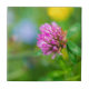 A closeup view of a pink clover flower against smooth multicolor background of a summer meadow. Purple, green, yellow and blue colours. The symbol of good life, comfort, wealth and prosperity