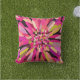 This throw pillow features an abstract flower in shades of pink, red, orange, purple, chartreuse, olive green, wine and lavender on a black background.