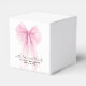Elegant baby girl shower thank you favour boxes featuring a beautiful watercolor of a pink coquette bow, "with love and thanks" in a chic script, and the name of the mother-to-be and shower date in modern lettering.