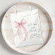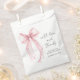 Elegant bridal shower thank you favour bags featuring a light pink watercolor of a delicate coquette bow, "with love and thanks" in a chic script, and the name of the bride and shower date in modern lettering.