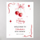 Welcome guests in style with this coquette-inspired cherry baby shower sign, featuring two hand-painted watercolor cherries tied with a delicate pink bow. Red retro starbursts and swirly accents add a playful vintage touch, while bold typography keeps it chic and easy to read from a distance. Perfectly matches the cherry invitation and thank you card for a coordinated look. Available in a large format ideal for displaying on an easel or framing at the party entrance. A sweet way to greet guests and tie your cherry-themed celebration together.