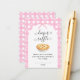 This charming diaper raffle enclosure card is designed as a coordinating insert to include with baby shower invitations. It features a cozy illustrated apple pie on a soft pink gingham background accented with delicate white floral details and a sweet coquette bow at the top. Elegant script typography highlights the title “Diaper Raffle,” while the clear message below encourages guests to bring a pack of diapers (any size) for a chance to win a prize. Perfect for pie-themed or bakery-inspired baby showers, this timeless pastel insert adds a fun and practical activity to your celebration and can be used for events held in any season.