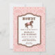 This cowgirl birthday invitation design features a rope border surrounded by a blush pink pattern. In the centre of the rope frame is a horse with the word "howdy" in a western font. You can personalise with all the party details. The back of the invitation is a coordinating pink bandanna pattern. YeeHaw!