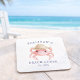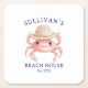 Add a charming coastal touch to your table with this personalized beach house coaster, featuring a sweet watercolor pink crab wearing a straw sunhat. Designed in a soft, airy palette of blush pinks, sandy neutrals, and classic navy blue lettering, this piece captures the relaxed elegance of seaside living with a light, cottagecore feel.