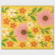 The design contains large pink flowers with soft rounded petals and a dark dotted center, surrounded by smaller flowers in orange and light cream colors. Slender branches with smooth green leaves connect the floral elements and add a natural flow. Small circular dots are scattered throughout the design, giving a light and cheerful touch. The background is a bright yellow tone that enhances the warm colors of the flowers and leaves. The overall style is simple and friendly, using flat shapes and clean colors to create a lively floral pattern.