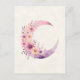 A postcard with a lovely illustration featuring a soft pink and purple crescent moon. Pretty pink and yellow wildflowers adorn this celestial body.