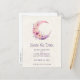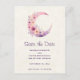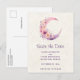 Save the date postcard with a lovely illustration featuring a soft pink and purple crescent moon. Pretty pink and yellow wildflowers adorn this celestial body.