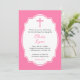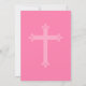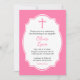 This sweet Baptism or Christening invitation features a pink cross and your text inside an ornate frame, set on a soft pink background. Your personalised text in a matching pink and black with a faded white cross on the back finishes your invitation.