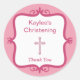 Personalised round Baptism / Christening stickers are a great way to customise your favour, seal your invitations or thank you cards or use for gift labels. This sweet design features a pink cross and your text inside a berry pink frame, set on a soft pink background.